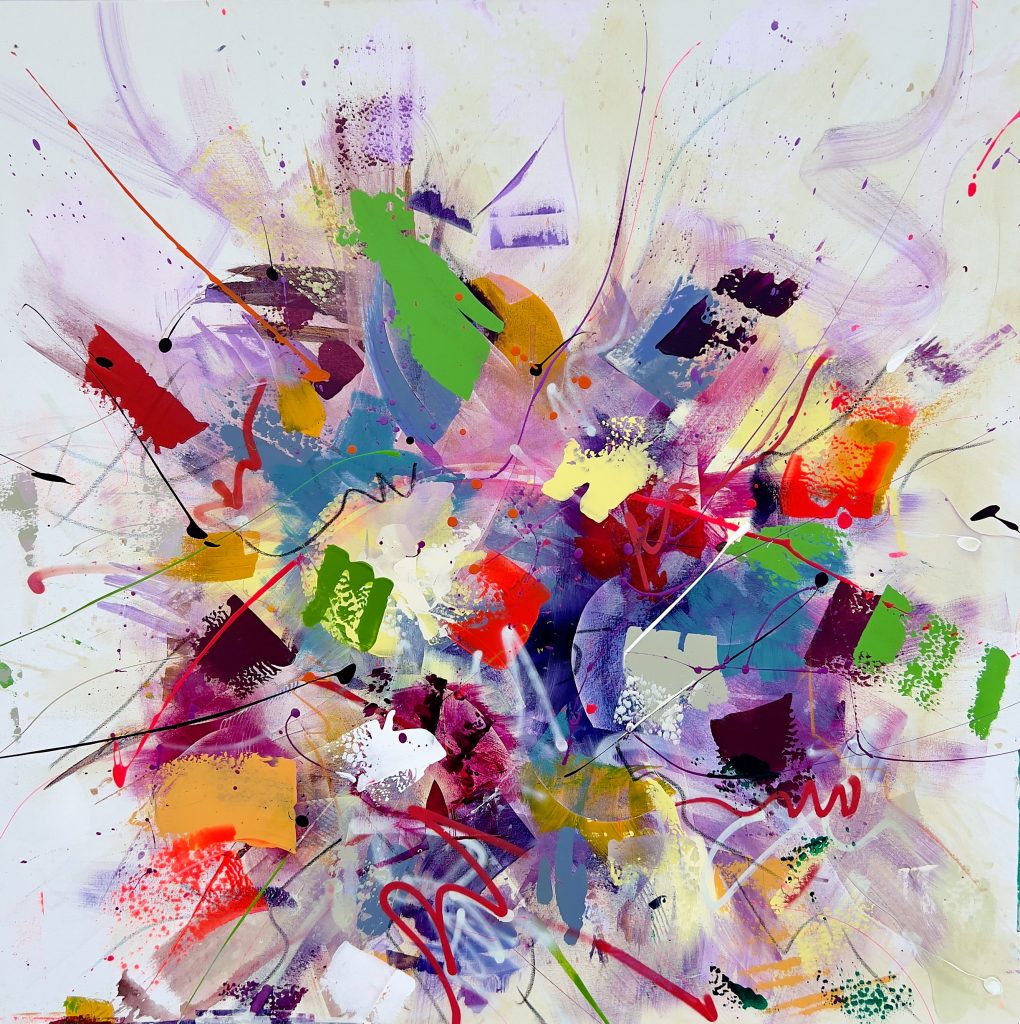 Ein Wirbel aus kräftigen Farben bricht wie ein Feuerwerk über die Leinwand herein – das erste Werk, das auf dem Salenhof entstand. Leuchtendes Grün, Rot und Gelb stoßen wild aufeinander, als würden Gedanken und Gefühle der ersten Hofmomente explodieren und sich doch zu einem harmonischen Garten fügen. Die energischen Linien und Splashes erinnern an Musik, die sichtbar geworden ist. Erde und Gras, Sonne und Abendhimmel, Stimmen und Stille. So ist dieses Bild nicht nur ein abstraktes Farbfeuerwerk, sondern auch ein emotionales Tagebuchblatt.